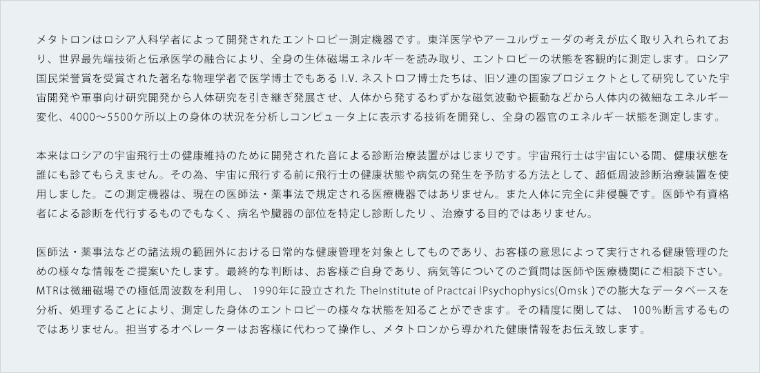 MTRは微細磁場での極低周波数を利用し、 1990年に設立された TheInstitute of Practcai lPsychophysics(Omsk )での膨大なデータベースを分析、処理することにより、測定した身体のエントロピーの様々な状態を知ることができます。その精度に関しては、 100%断言するものではありません。担当するオペレーターはお客様に代わって操作し、メタトロンから導かれた健康情報をお伝え致します。